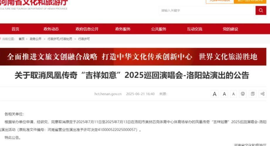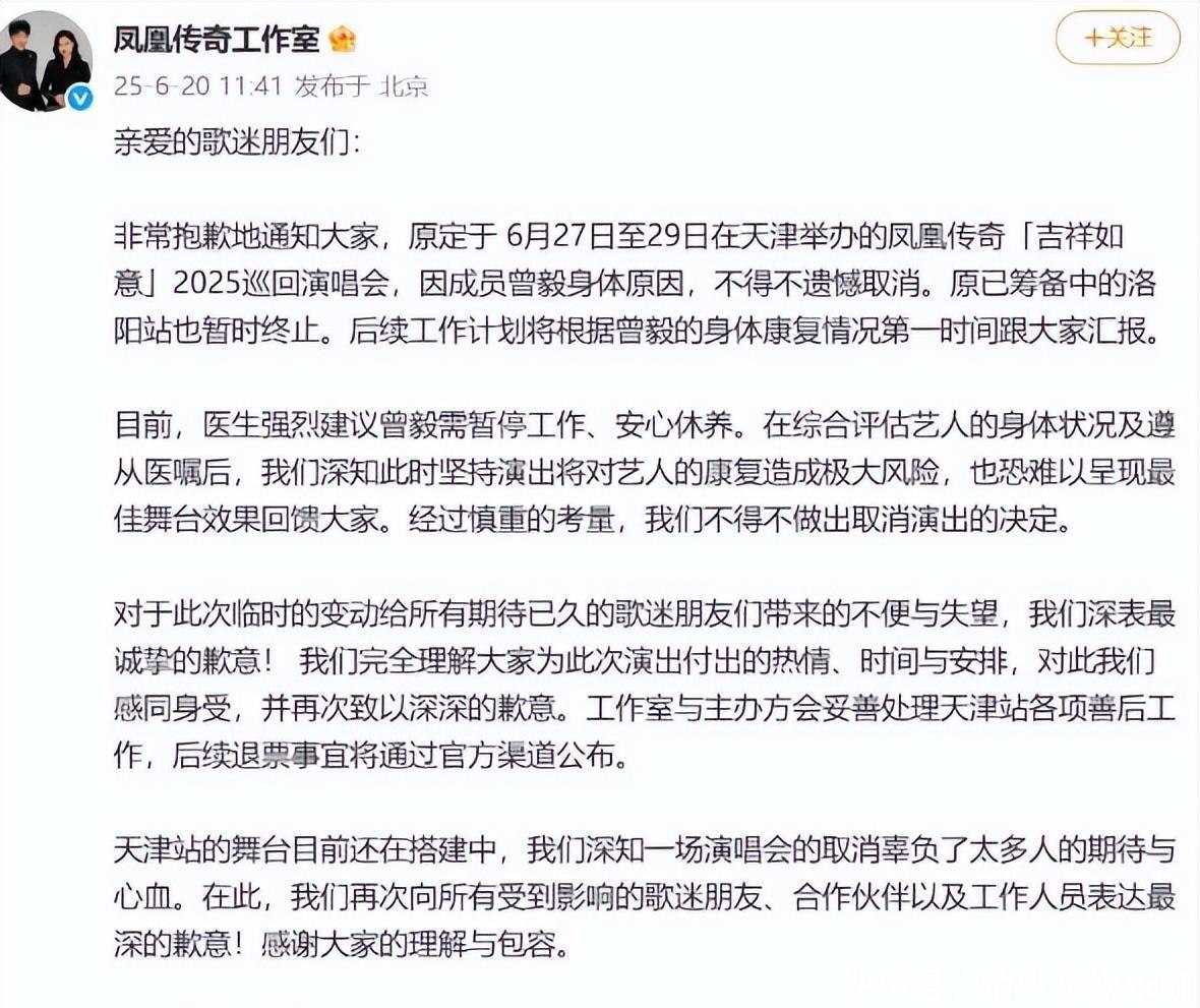 风波的影响很快波及事业。6月20日,凤凰传奇工作室官方微博发布公告,宣布原定于6月底在天津举行的“吉祥如意”2025巡回演唱会,因成员曾毅身体原因取消。次日,河南省文化和旅游厅官网也跟进公告,取消该巡演的洛阳站计划。一系列演出活动的突然中止,让“组合因风波内部不和、或将解散”的猜测达到顶峰。